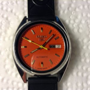Men S Seiko 5 Black Silicone Orange Dial World Of Watches